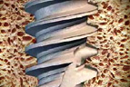 The expanding tapered body and double variable thread design of NobelActive™ produces a gradual bone-condensing property, illustrated here using a simulated bone background.
